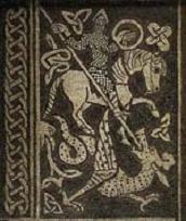 Solidement dressé sur son cheval, corps et tête de face, il tient dans sa main droite une lance transperçant la gueule ouverte du dragon.